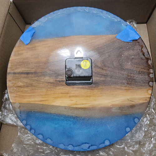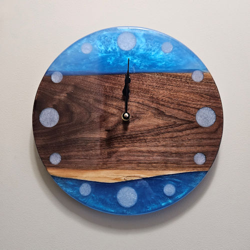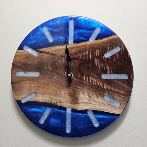 This elegant 12" diameter clock features Walnut wood highlighted with a medium pearl blue epoxy resin. The number markings are white pearl epoxy resin. The entire clock face is finished with a coat of clear gloss epoxy resin. The clock is approximately 1" thick and operates on 1 AAA battery and has an intergraded wall hanger.