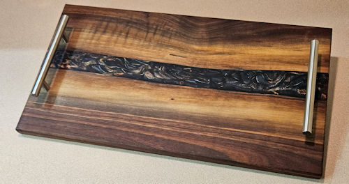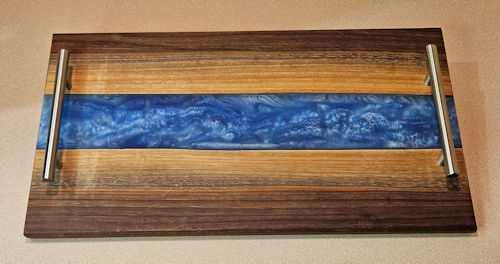 This Walnut board has brown gray and red tones along with a cloudy blue wide epoxy river. It measures approximately 10" wide x 18" long x 5/8" thick. It features the classic silver metal handles.