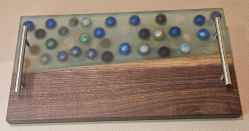 This Walnut charcuterie board has brown and gray tones and a sliver of lighter sapwood . The multi color embedded ice cubes create an interesting visual.