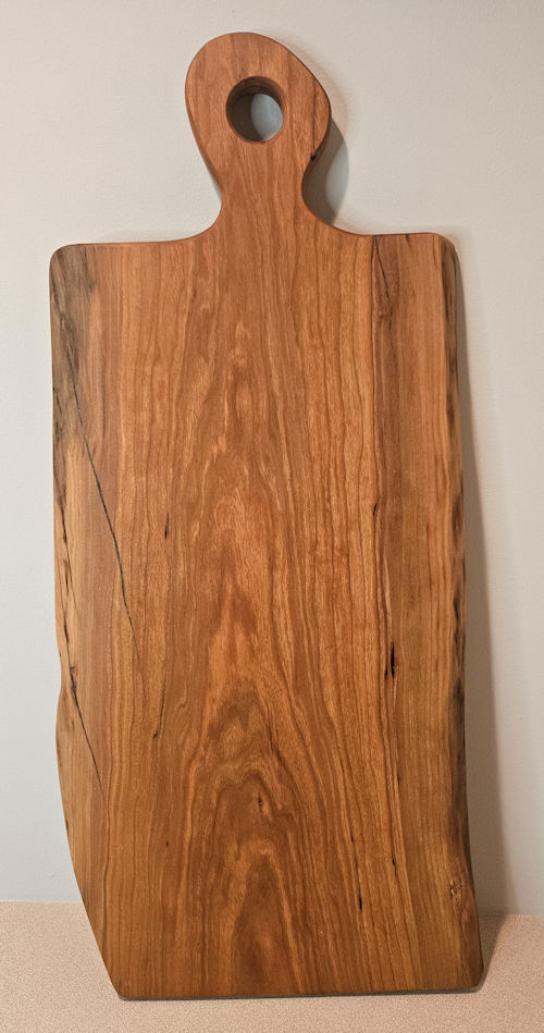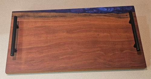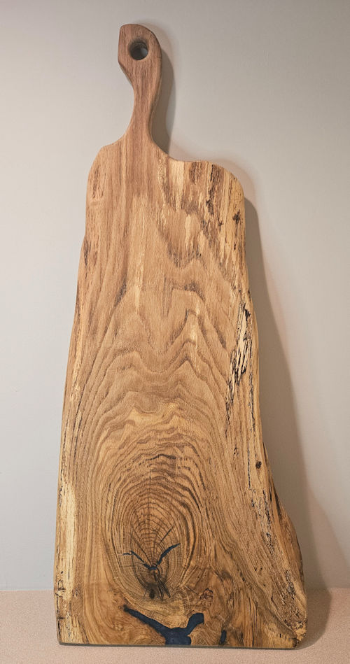 These large and oversize wood handle boards, will be the center of attention and make a great presentation or serving display. One of the frequently asked questions is can they be used as a cutting board also. The answer is yes, although I suggest you cut on another board and use this for display. Occasionally I will use epoxy resin to fill a small knot or void. The epoxy is totally food contact safe, but please avoid cutting directly on the epoxy, as it will scratch.. If you have been to one of my shows you know the pictures do not do these creations justice.